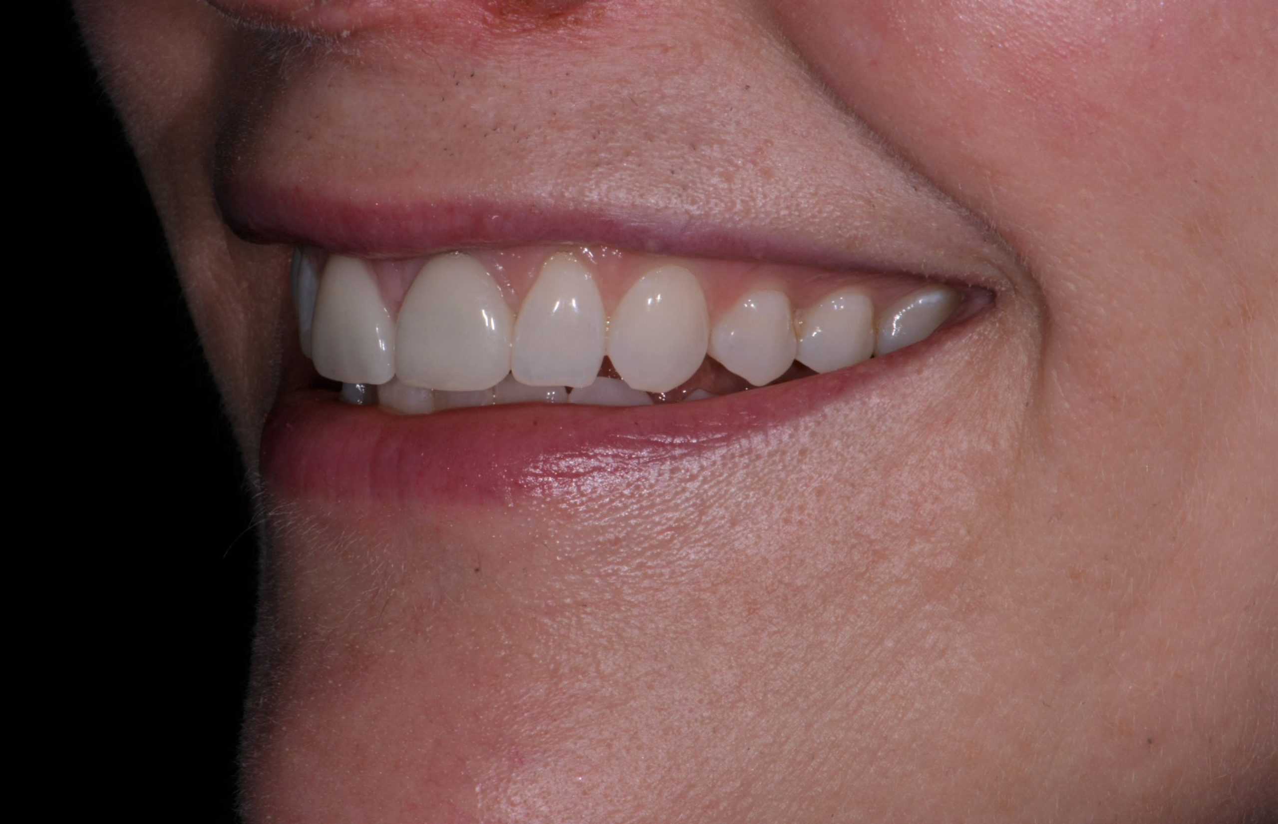 An old, defective crown suddenly broke off along with a portion of the neighbor tooth. She had been wanting to improve upon the previous crown yet maintain her characteristic space (diastema) between the front two teeth. A new crown and an adjacent veneer and she loves her restored smile