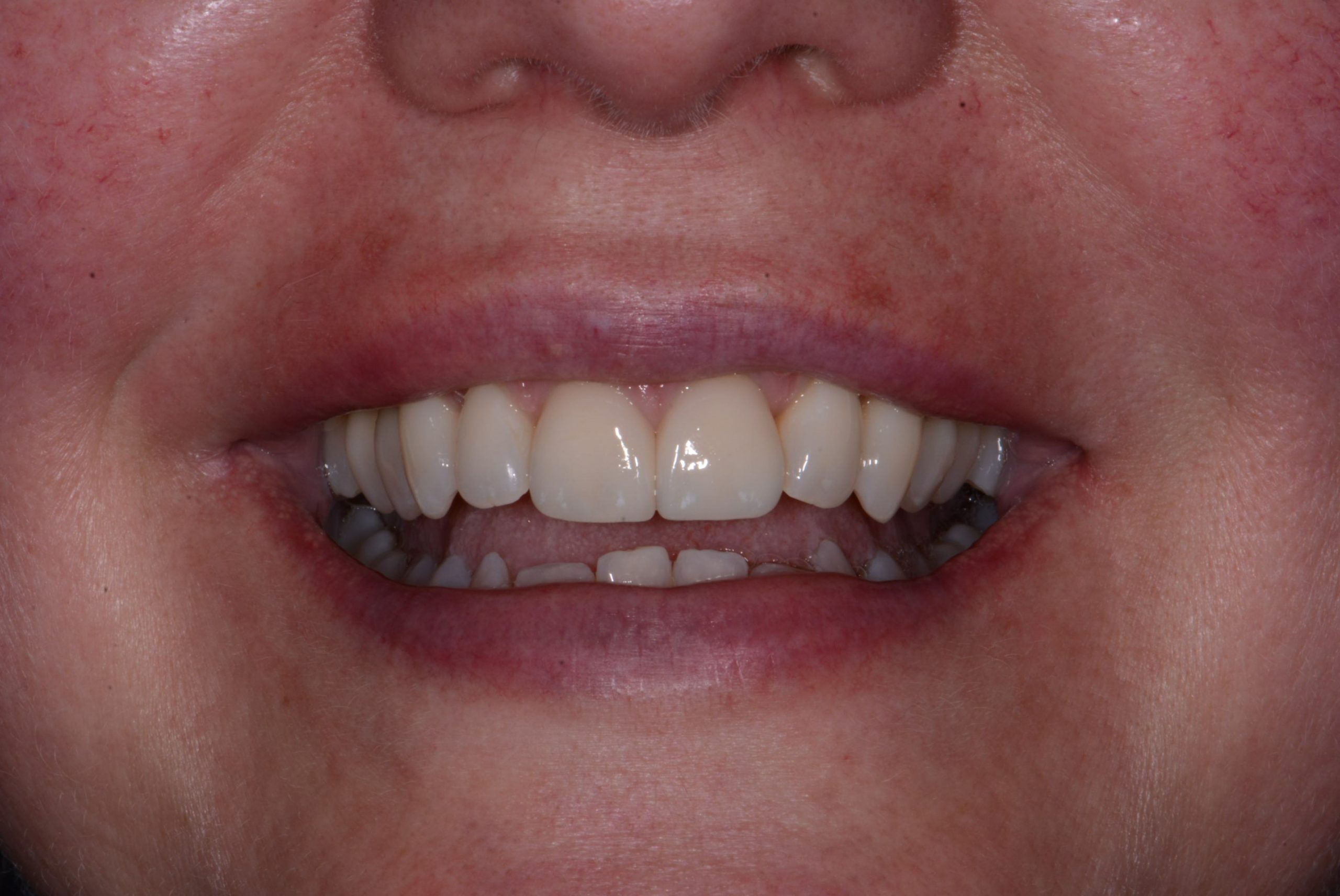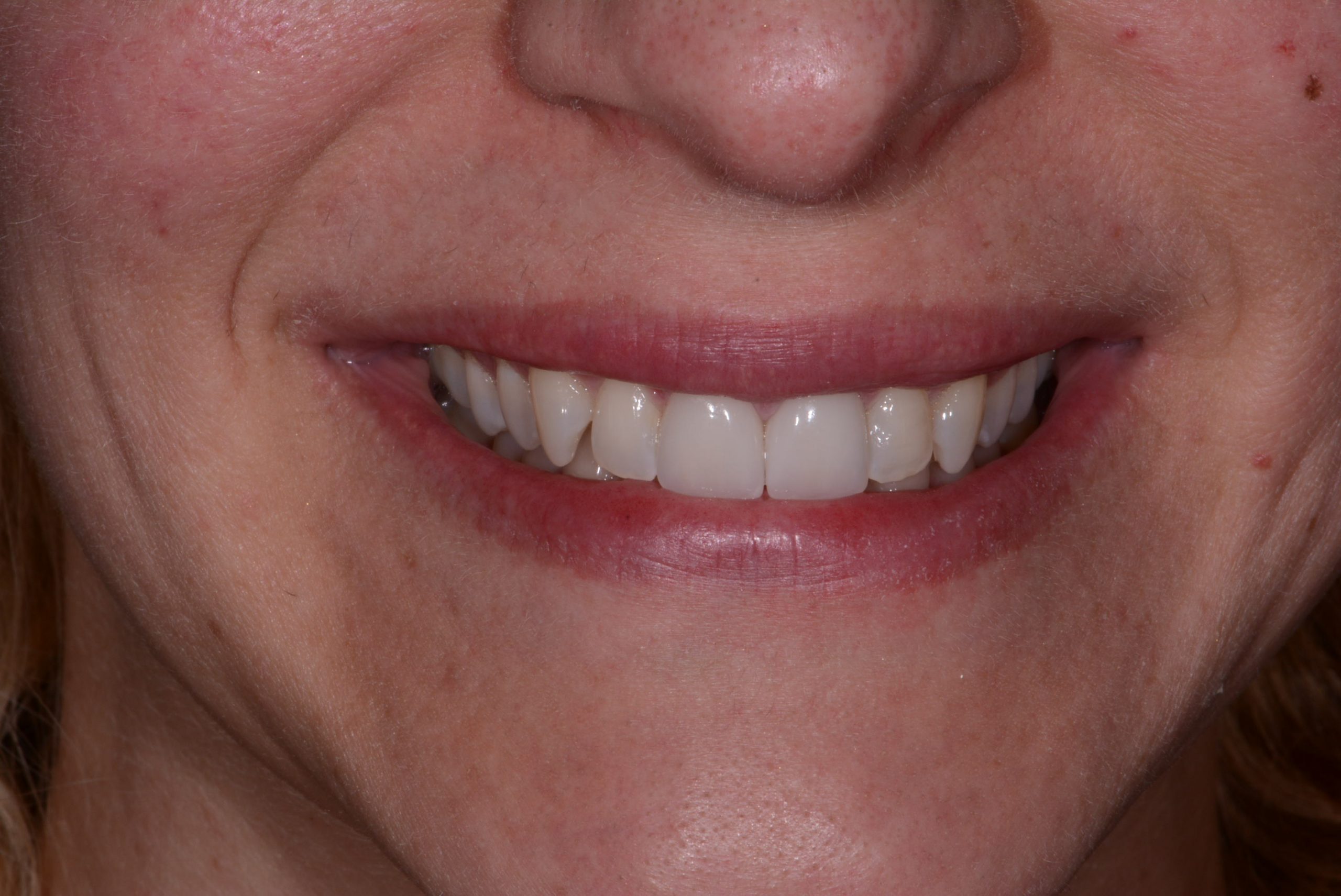 Small spaces or gaps between the teeth often result from relapse after orthodontic treatment but can be closed conservatively with the application of filling material to the teeth on either side of the space. No anesthetic is necessary for this procedure and we can match the color of the teeth. Ceramic veneers or another round of orthodontics using clear aligners can also close the space.